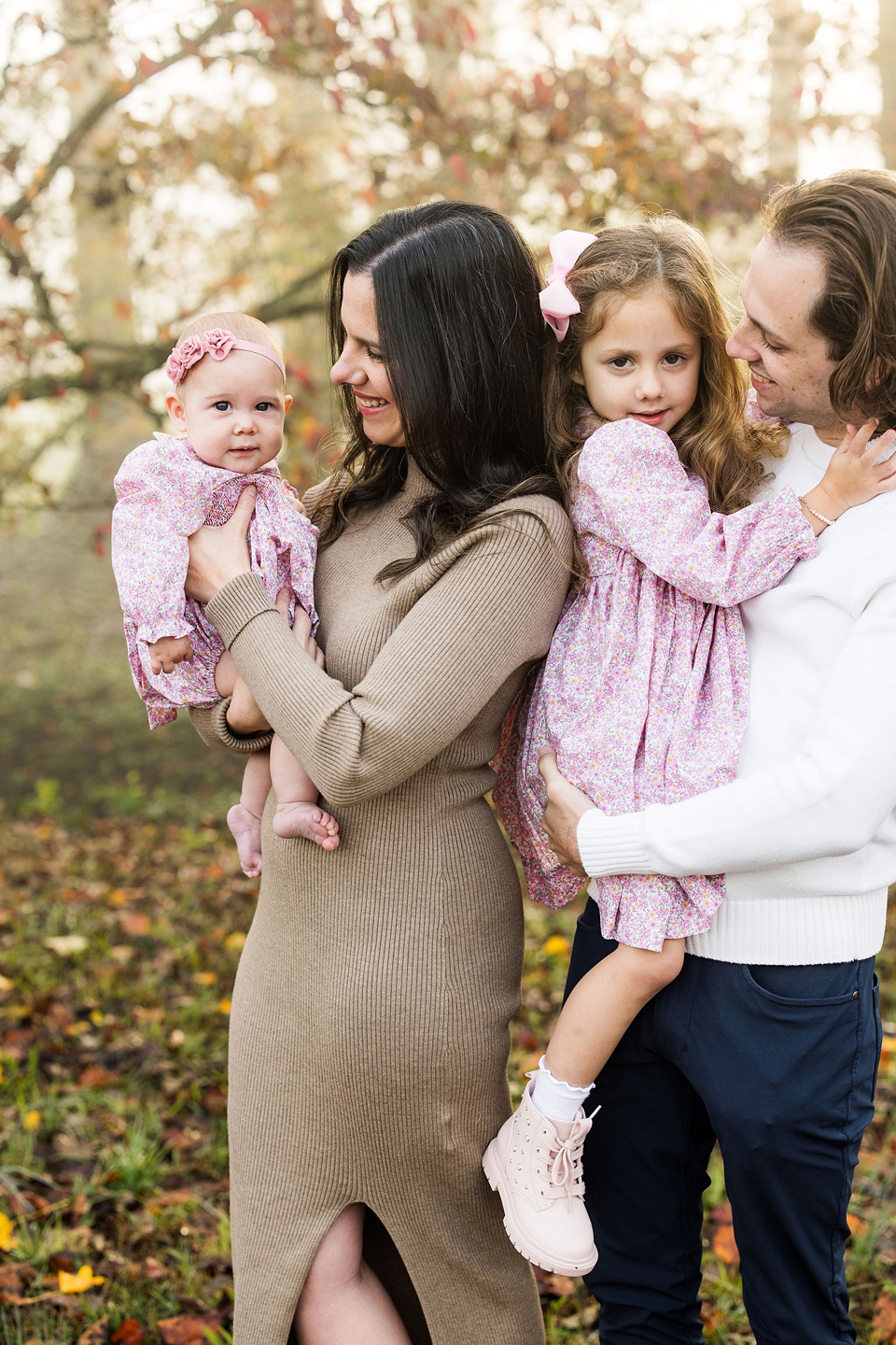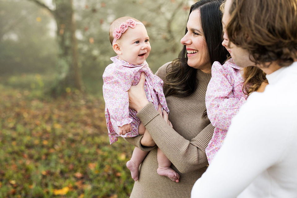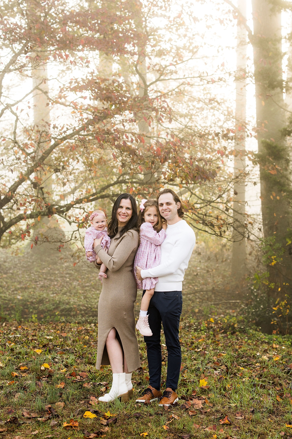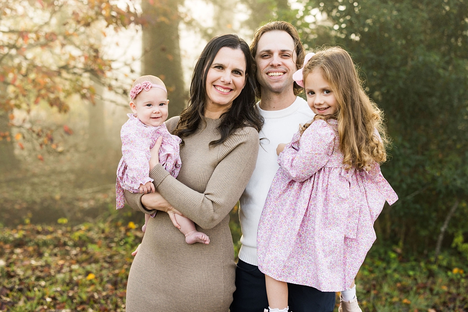 I have loved photographing this sweet family over the last 4 years. I have photographed them before the girls were born and I have loved watching the girls grow up in front of my camera. This was take two for this session because the first date we scheduled we showed up and it started pouring!! Thankfully we had a beautifully, chilly fall morning that ended up being perfect!! Love how the fog started with us during the session and then dissipated as our time together went on. So excited to share a few of my favorite images from my time with these four!!